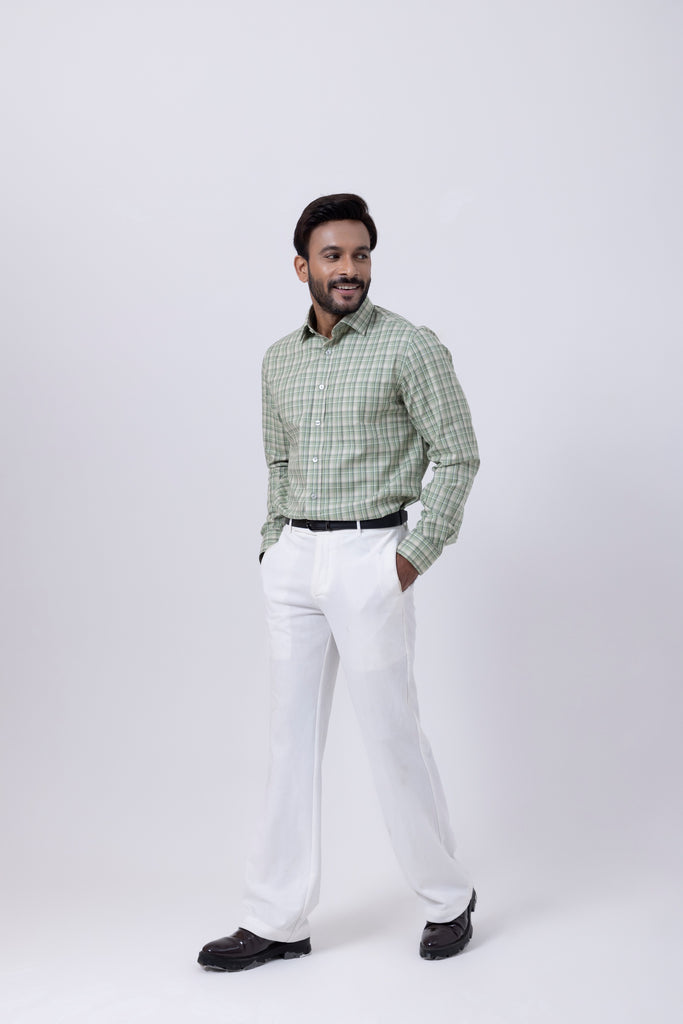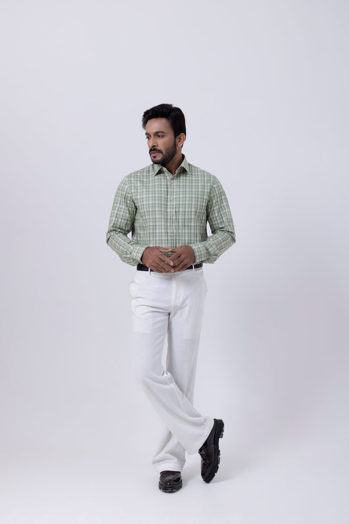 Featuring a sophisticated weave of elegant green and white checks, this shirt presents a classic yet fresh look. Designed with an English Spread collar, a single cuff, and a practical chest pocket, it boasts subtle elegance and a lightweight feel. Perfect for both formal and smart-casual occasions, this men's cotton checkered shirt from TAILORS COVE combines timeless style with unparalleled comfort.