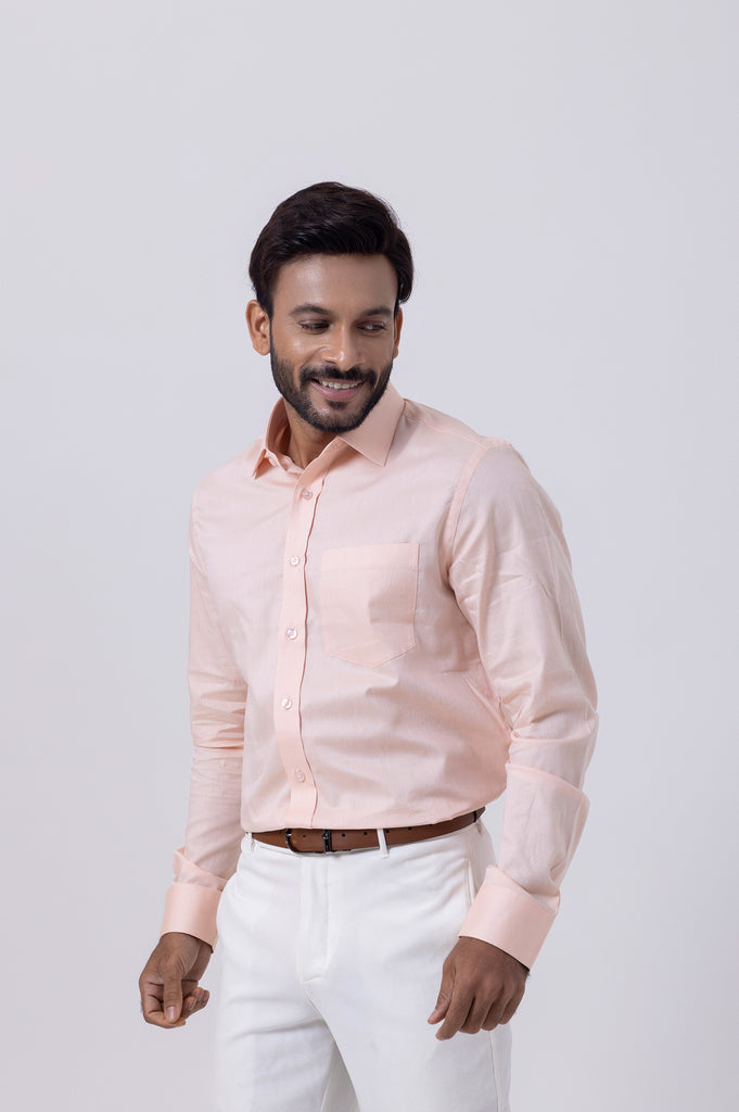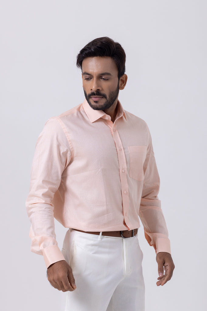 Order online Men's Premium Giza Cotton Peach Shirts at Tailors Cove. Crafted from 100% premium Giza Cotton, the regular fit, stranded collar, chest pocket, and full sleeve exude timeless charm, perfect for formal occasions. The single cuff adds a touch of modernity to this classic piece. It's lightweight ensures comfort, while the medium shine adds a dash of elegance.