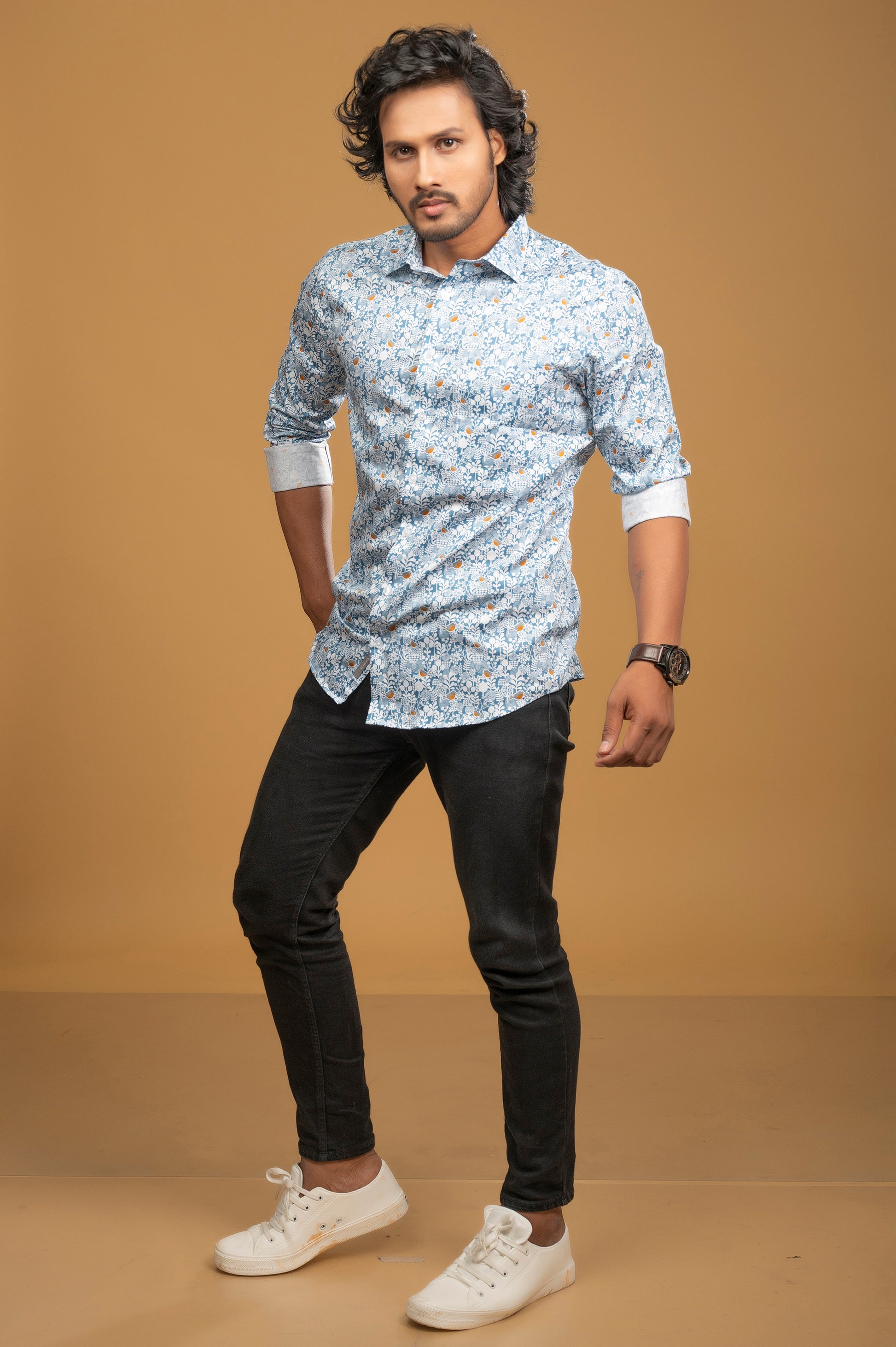 White & Blue Floral Print Shirt